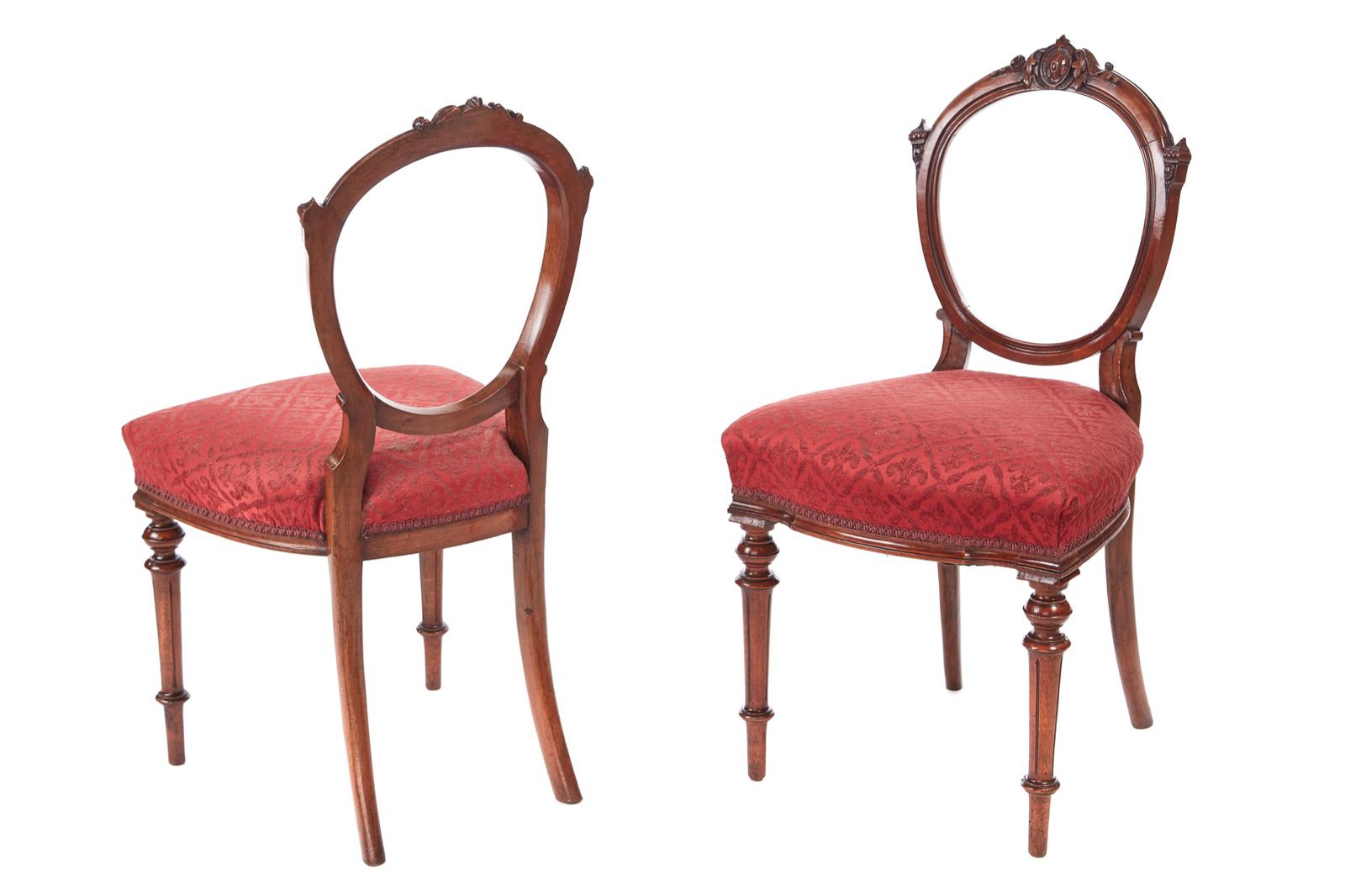 Finest quality pair of antique Victorian walnut desk/side chairs with an elegant carved walnut shaped balloon back, recently reupholstered seats with serpentine fronts. They stand on turned and reeded legs to the front and out swept back legs.