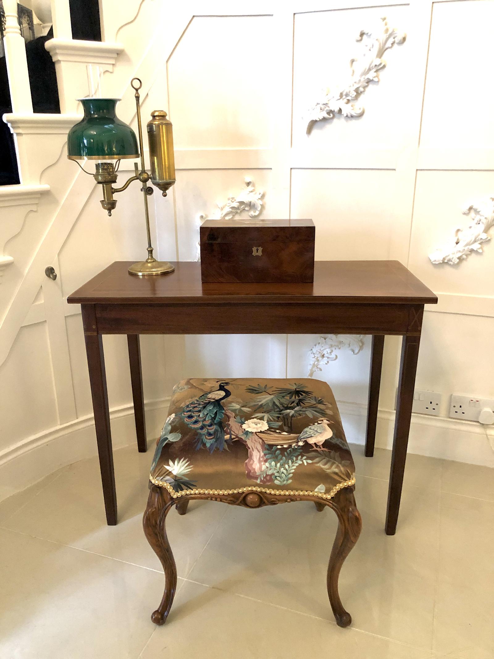 George III antique mahogany side table having a spectacular mahogany inlaid top with boxwood stringing and an impressive inlaid mahogany frieze standing on four square inlaid mahogany tapering legs.