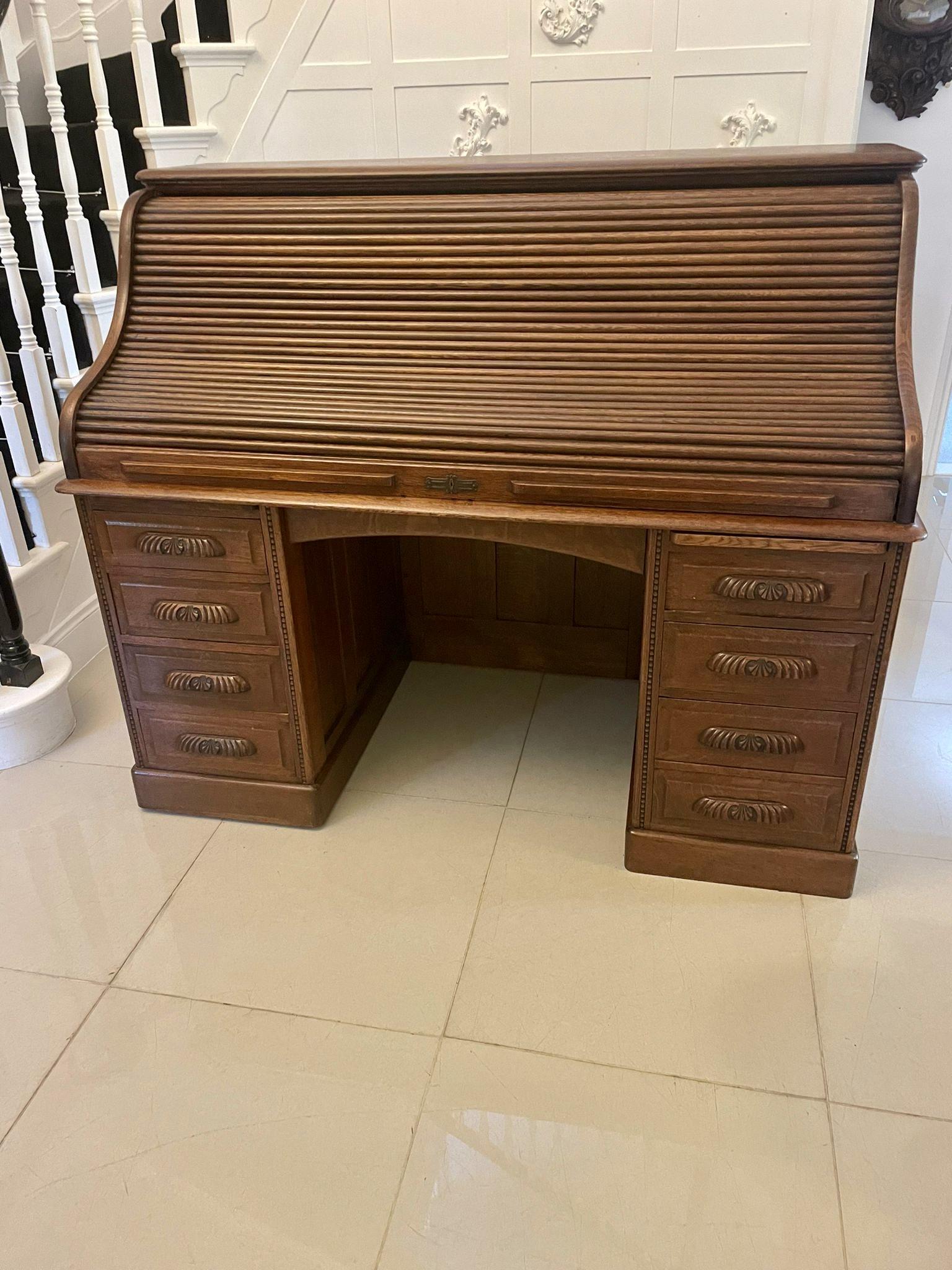 Large antique Edwardian freestanding quality oak roll top desk with fielded panels to all sides and back, quality swan neck tambour opening to reveal a fitted interior consisting of drawers, pigeon holes, pen trays, storage compartments and a writing surface above seven drawers with wonderful carved oak handles and two pull out slides standing on plinth bases with original castors