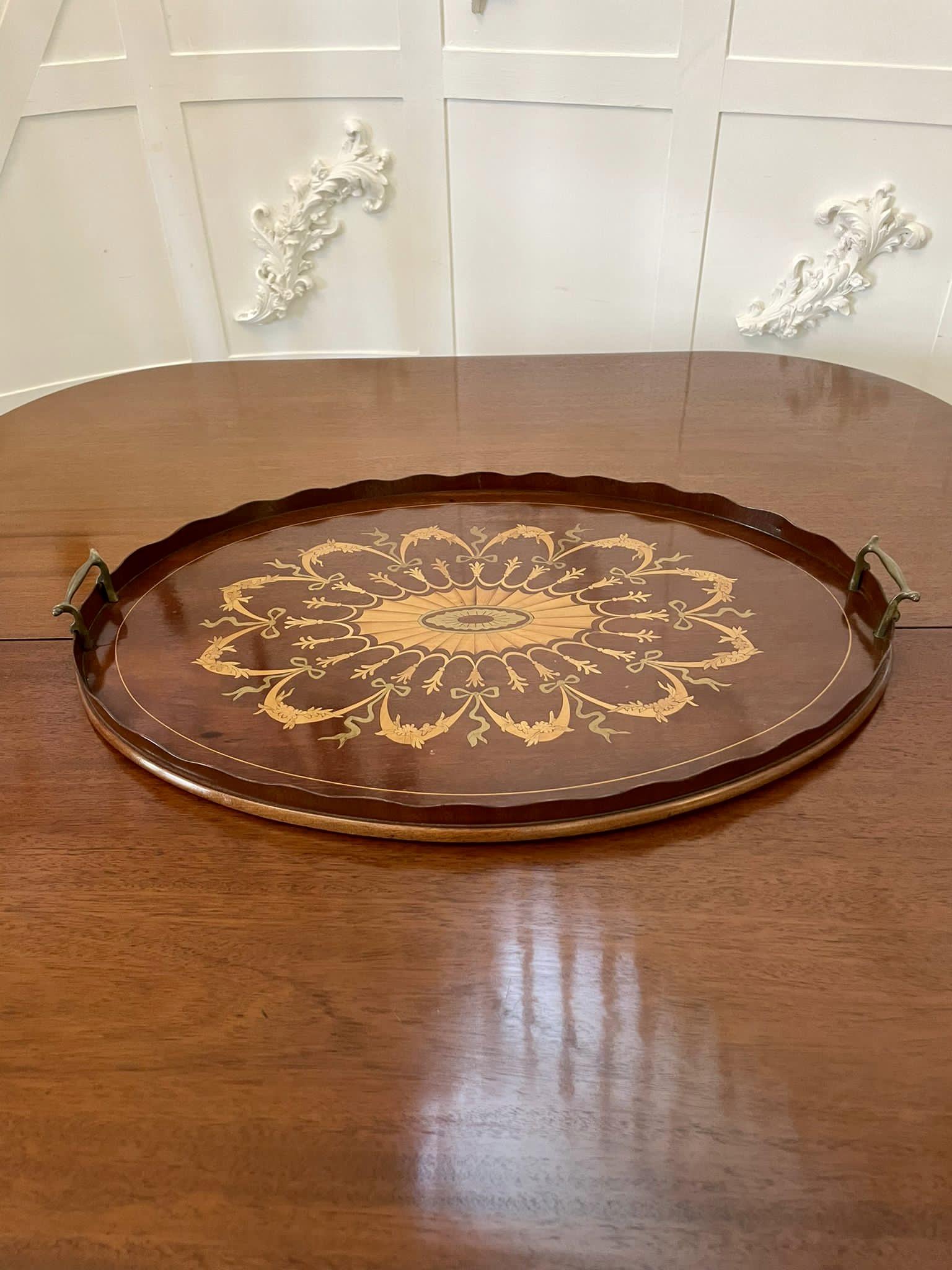 Outstanding quality Edwardian inlaid mahogany oval tray with original brass handles having a striking intricate inlaid centre with garlands around a large shell and boasting a pretty scalloped edge. An attractive example boasting an exquisite colour and in wonderful original condition.